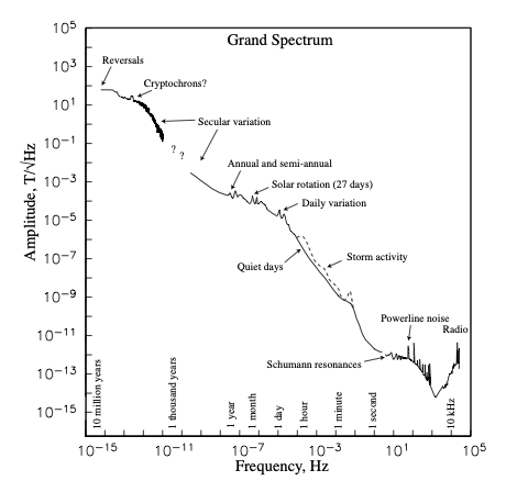 Quelle der Felder: (a) Durch Sonnenwind und/oder EM-Strahlung erzeugte Ströme in Ionosphäre und Magnetosphäre mit \(0.01 < T < 10^4\) s, (b) weltweite Gewitteraktivität mit \(f < 10\) kHz