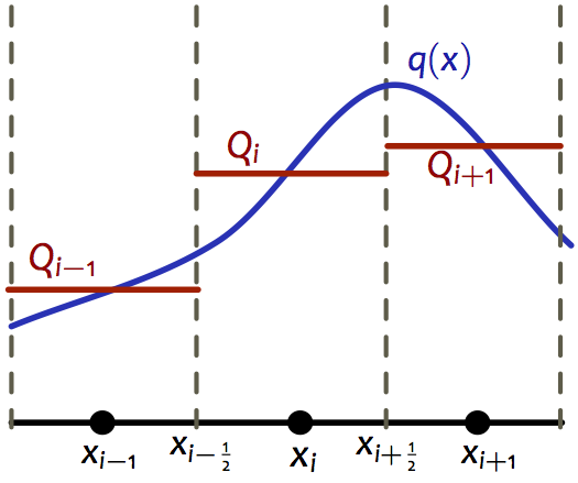 \[ \overline{u}_i(t) = \frac{1}{x_{i+1/2}-x_{i-1/2}} \int_{x_{i-1/2}}^{x_{i+1/2}} u(x, t)\dd x \]